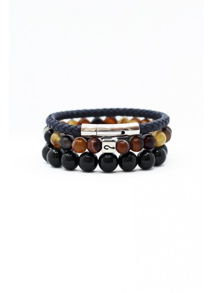 Pack conformado por 1 pulsera Elio azul marino (cuero genuino), 1 pulsera de piedras ágata marrones N8 y 1 pulsera de piedras onix N10.
