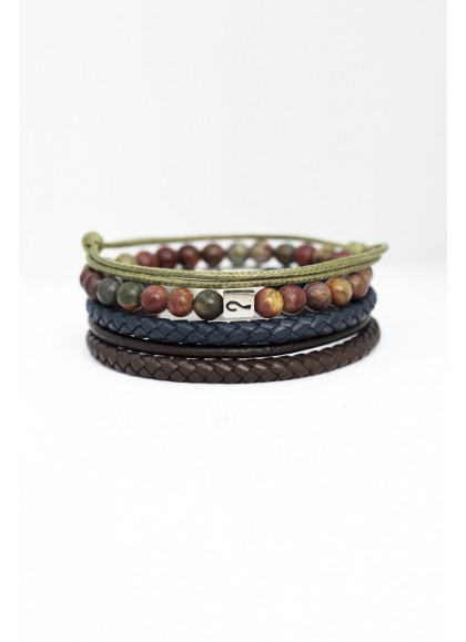 Pack conformado por 1 pulsera Bruno (cuero genuino y broche de acero inoxidable), 1 pulsera de piedras jaspe de 6 mm y 1 pulsera regulable.