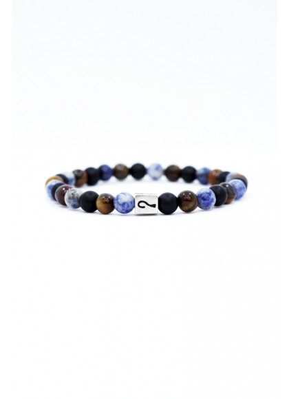 Pulsera elástica elaborada con piedras naturales sodalita, onix, ojo de tigre y dije de zamac.