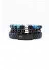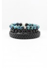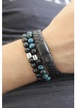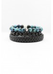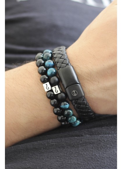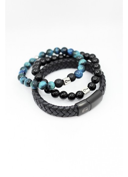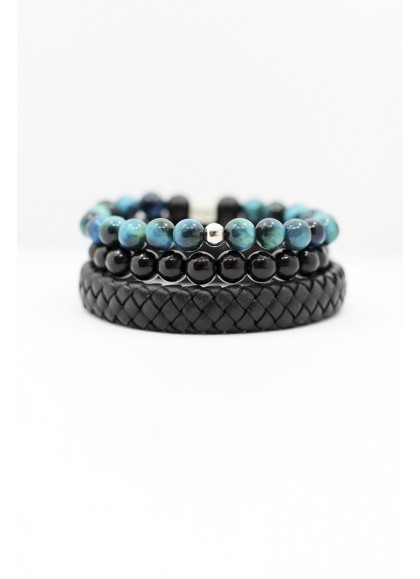Pack conformado por 2 pulseras de piedras naturales de 8 mm (ojo de tigre y onix) y 1 pulsera de cuero genuino y broche de acero inoxidable.